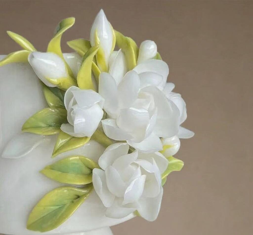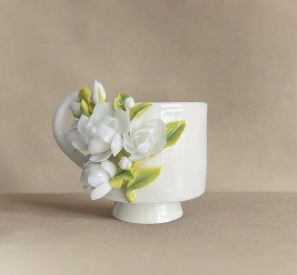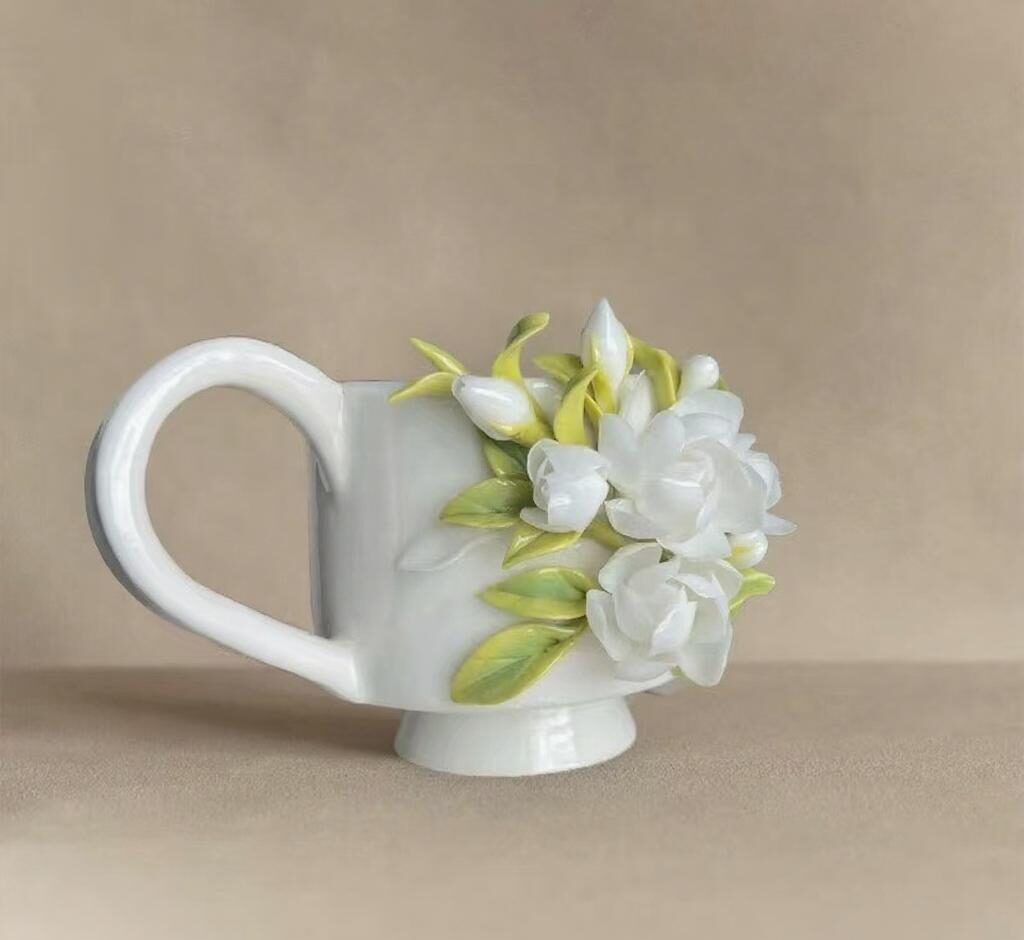 This charming cup showcases exquisite artistry with its delicate three-dimensional floral design. A cluster of white flowers with soft petals and subtle yellow centers blooms gracefully from the side, accompanied by gentle green leaves. The pristine white ceramic and gracefully curved handle provide an elegant backdrop, allowing the intricate blossoms to take center stage. this piece beautifully blends artistic craftsmanship with everyday functionality, adding a touch of natural elegance to any moment.