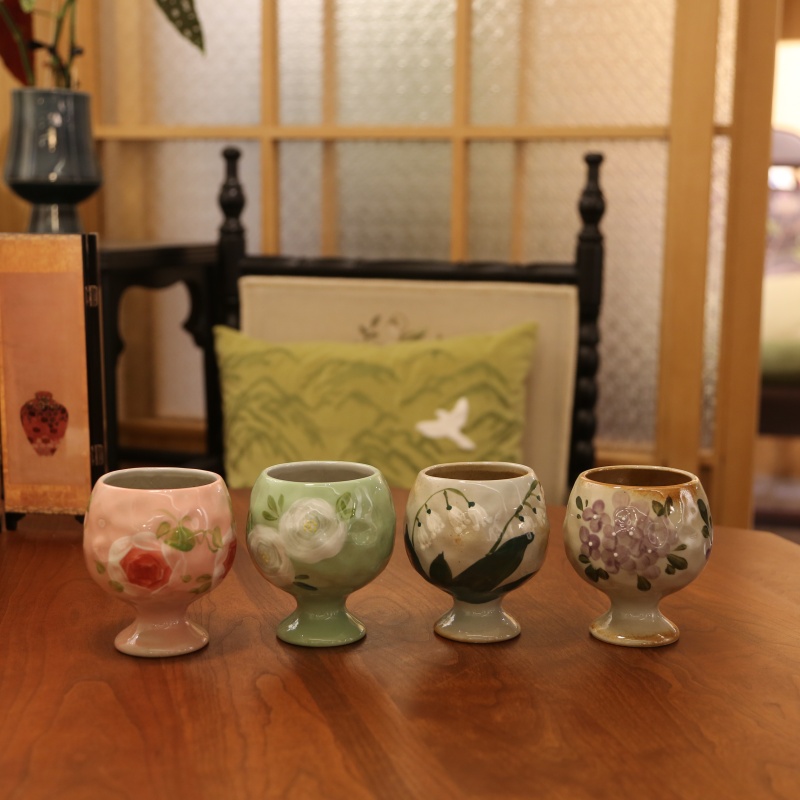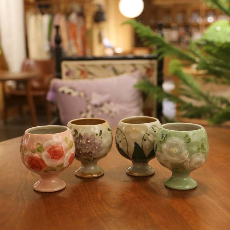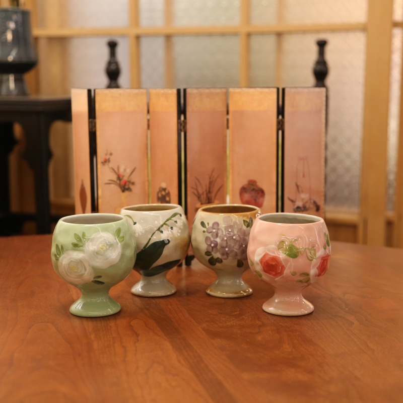 These four footed cups are a delightful set, each adorned with unique floral patterns and vibrant colors . With their elegant, short – stemmed design, they blend artistry and functionality. Perfect for serving drinks or as decorative pieces, these cups bring a touch of nature – inspired beauty to any space, combining charm and practicality in a graceful, four – word – named (Four – Flowered Footed Cup) design.