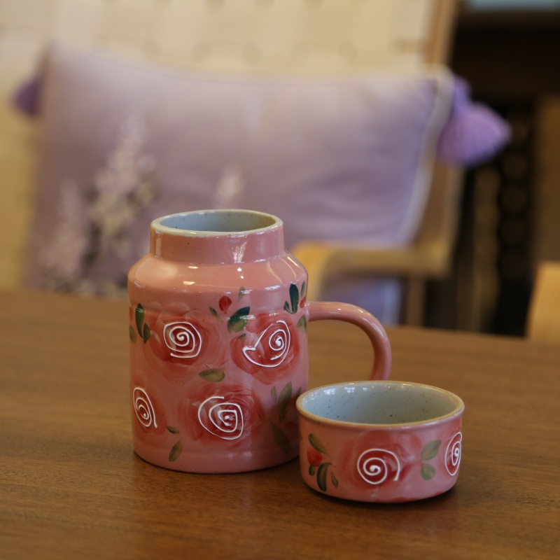 Adorned with delicate floral patterns, this charming cup is truly eye-catching. Its soft pink base, paired with vivid flowers and green leaves, creates a romantic and cozy atmosphere. The unique spiral design adds an artistic touch. Whether you use it to enjoy your morning coffee or as a desk ornament, this flower-patterned cup will add a touch of beauty and elegance to your daily life.