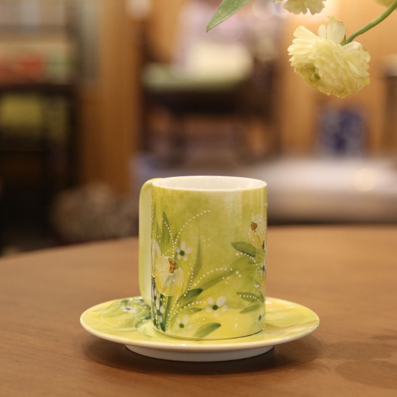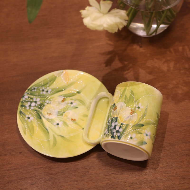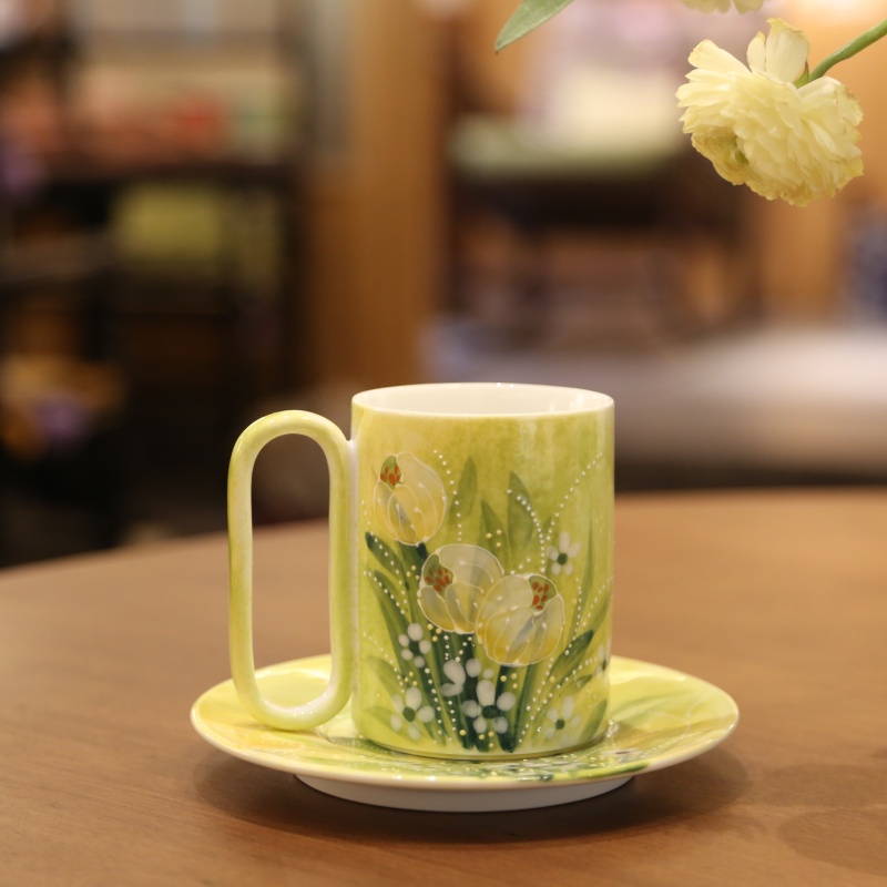 This exquisite porcelain tulip cup and saucer set radiates timeless elegance with its soft pale-yellow glaze, evoking a sense of warmth and sophistication. The delicate hand-painted white blossoms and green leaves, accentuated by subtle white dots, create a harmonious botanical motif reminiscent of a spring garden. Its gracefully curved handle ensures a comfortable hold, while the matching saucer completes the classic ensemble. Perfect for a quiet coffee break or an afternoon tea, this set brings a touch of refined charm to any occasion.
