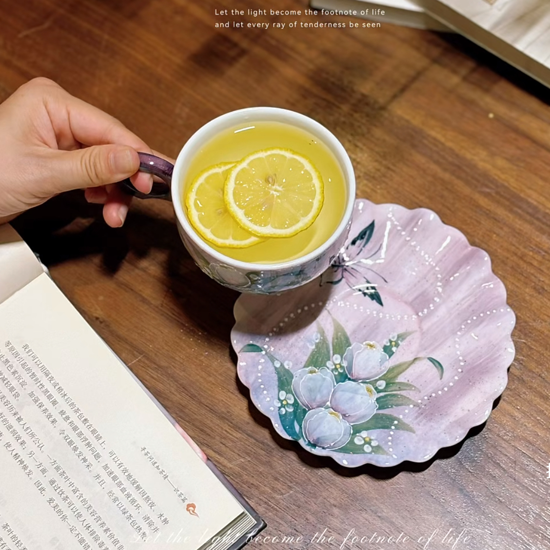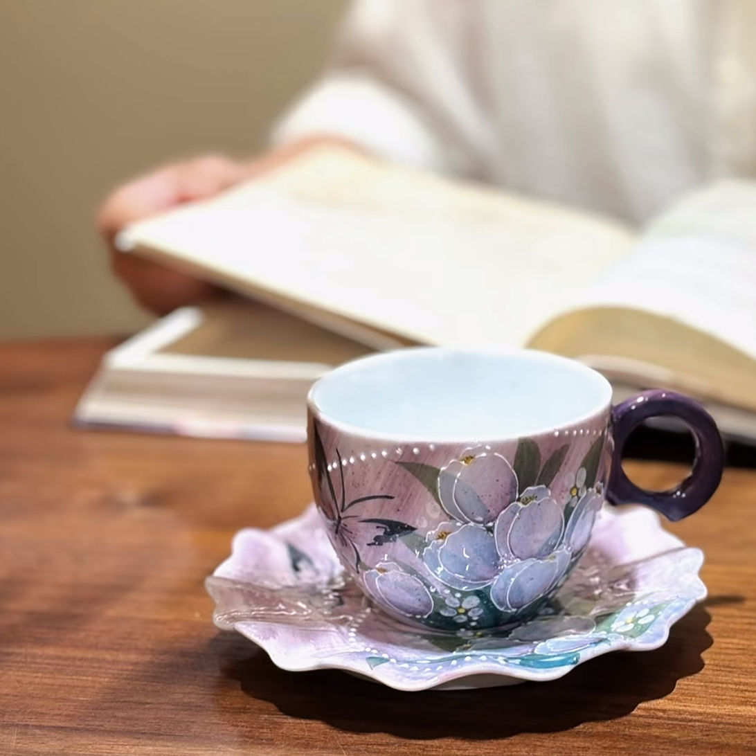 Delicately hand-painted with soft tulip blossoms and graceful butterflies in pastel hues. The cup’s distinctive deep blue handle provides an elegant contrast to the gentle floral motifs, while the saucer completes the harmonious pairing. Perfect for a quiet afternoon of reading and reflection, this set artfully blends botanical beauty with timeless sophistication, inviting you to savor a moment of peaceful indulgence with every sip.