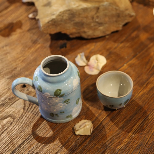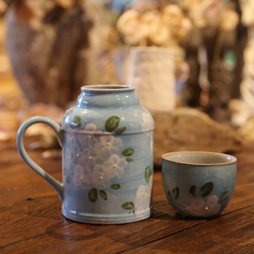 This charming ceramic thermos brings a refreshing breath of spring to any setting. With a soothing sky-blue base, it is hand-painted with delicate white flower clusters and vibrant green leaves. Boasting a practical handle and elegant design, it perfectly blends functionality with artistry. Ideal for keeping your favorite drinks warm, this thermos is more than just a container — it is a portable piece of floral elegance.