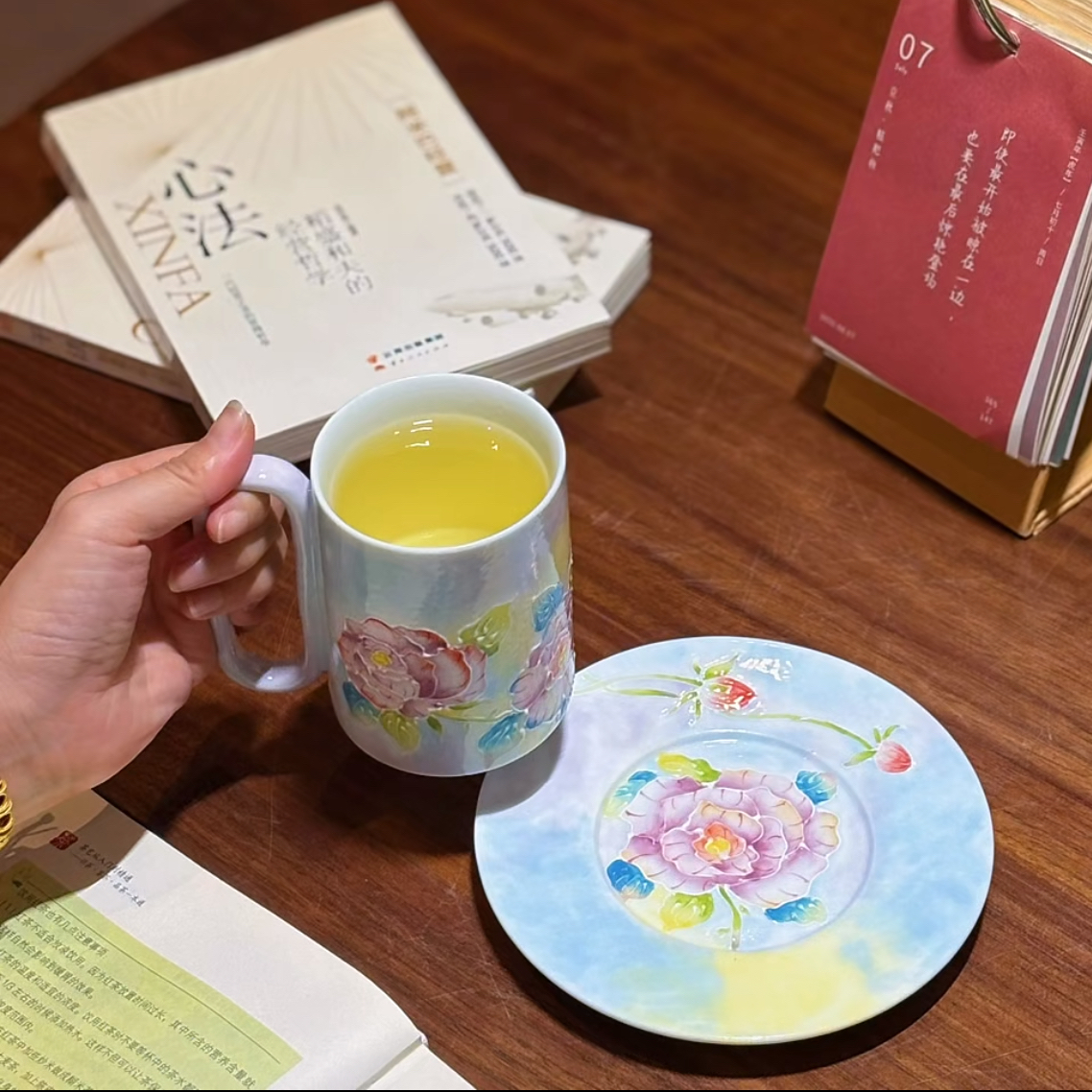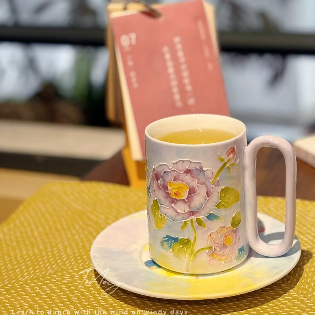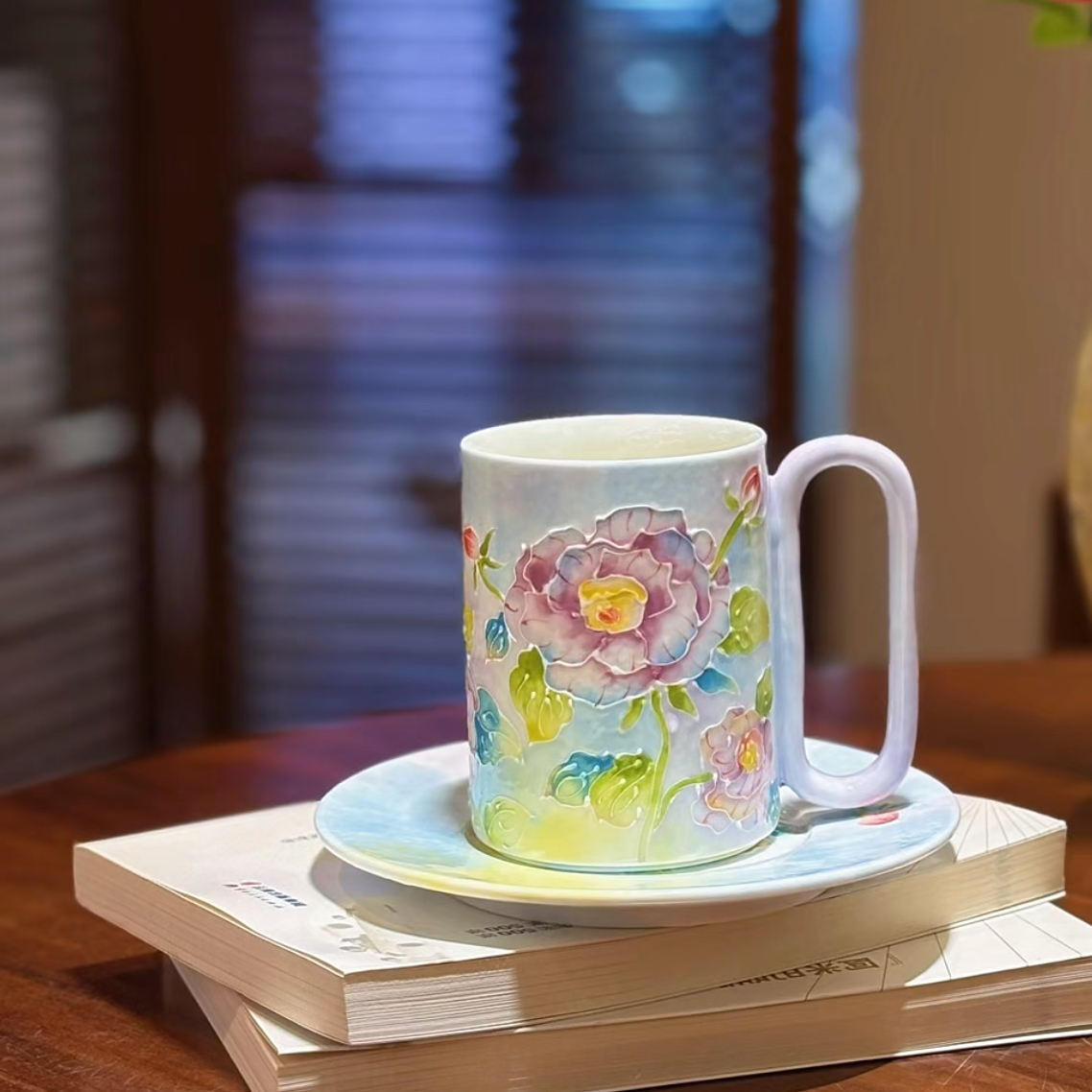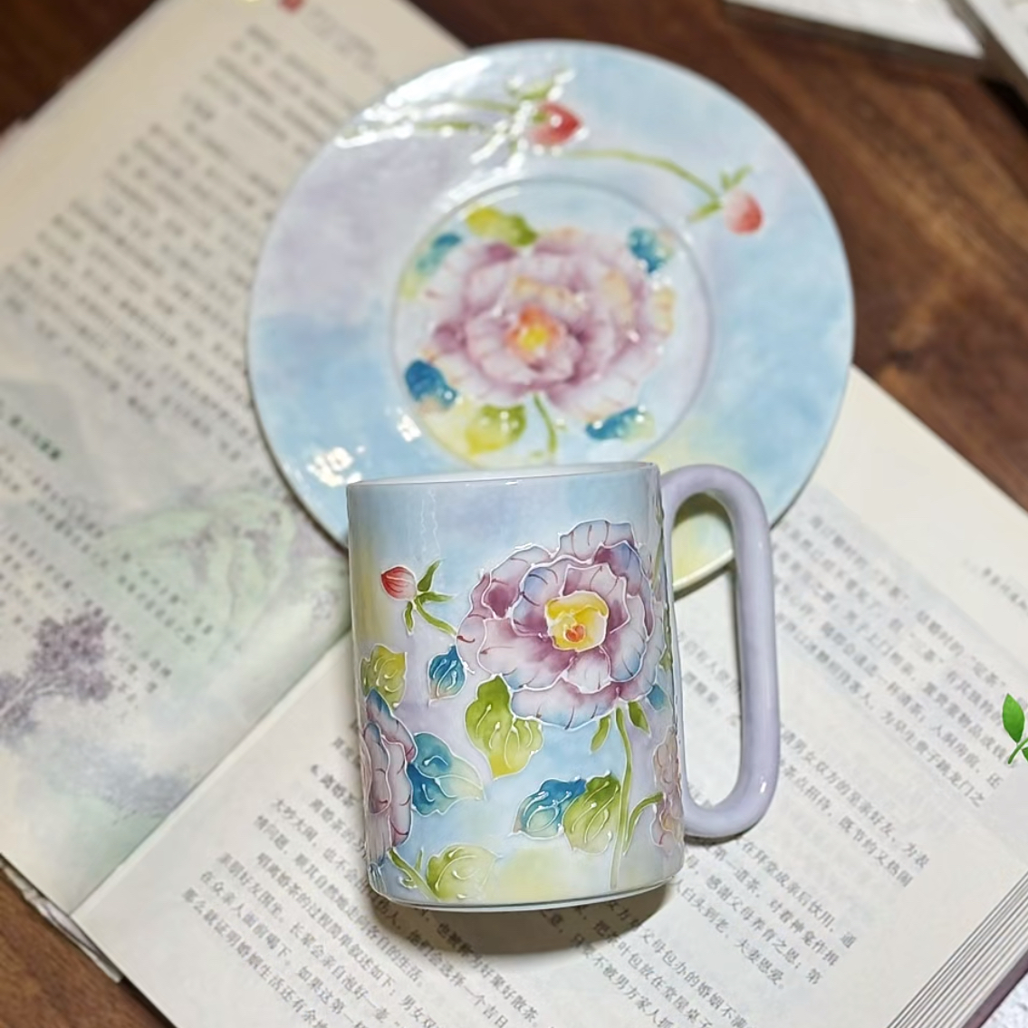 This charming ceramic coffee/tea set adds timeless elegance to your coffee/tea-drinking moments.The cup and its matching saucer feature a soft sky-blue base, adorned with delicate hand-painted purple peony flowers in pastel pink, lavender and green hues.The elegant grey handle offers both comfort and style.It is more than just tableware — it is a beautiful adornment that creates serene and enjoyable moments for you.