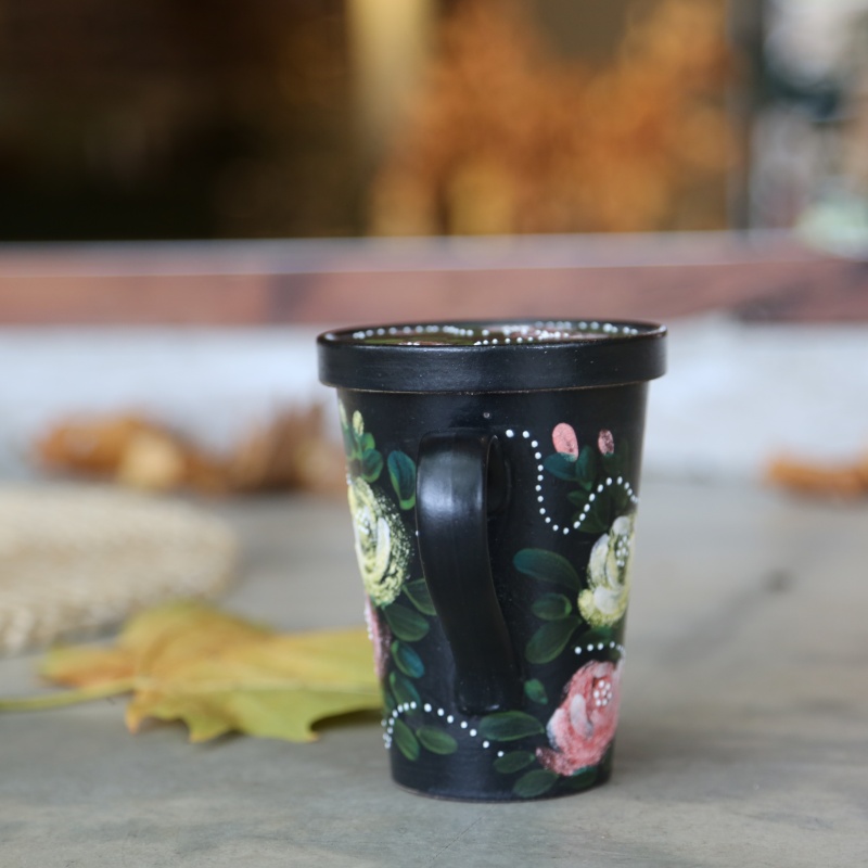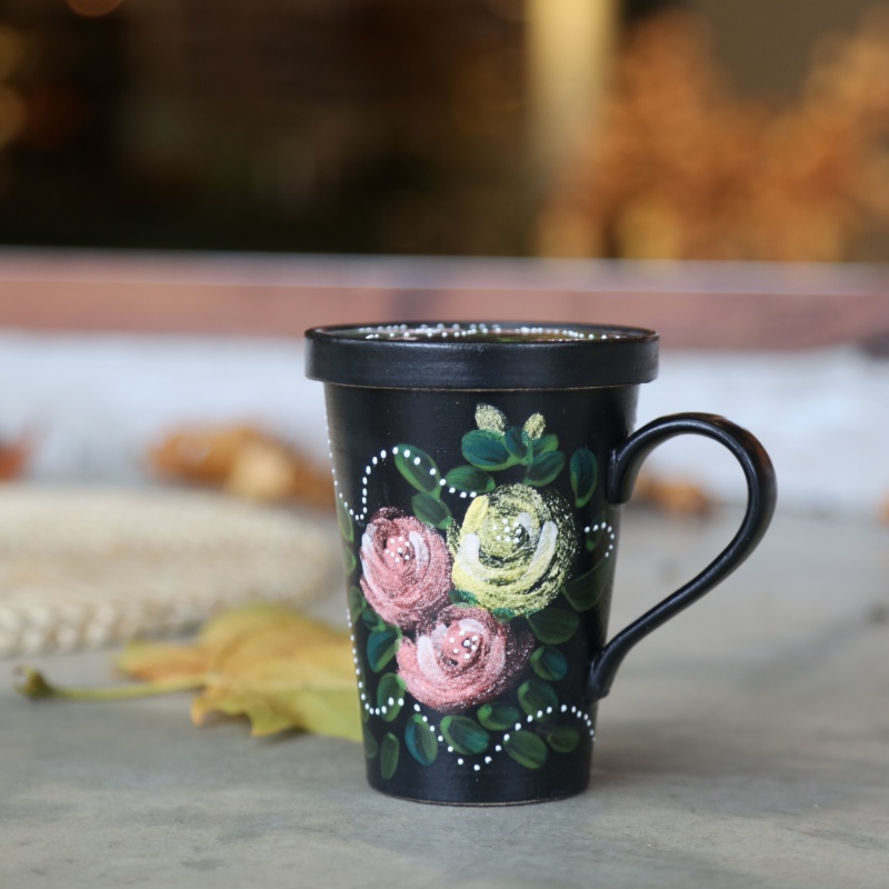 In addition, it is also decorated with three-dimensional glaze, giving certain parts of the design a raised, tactile quality. Soft pink and white roses, intertwined with green leaves, bloom gracefully across its surface. A unique dotted line traces a subtle heart shape around the flowers, adding a layer of romantic charm. The sleek black handle provides a comfortable grip, completing its sophisticated silhouette. This mug evokes a sense of warm, cozy tranquility, making it an ideal companion for quiet moments of reflection with a favorite hot beverage.