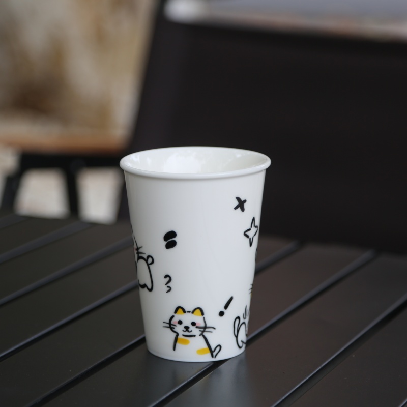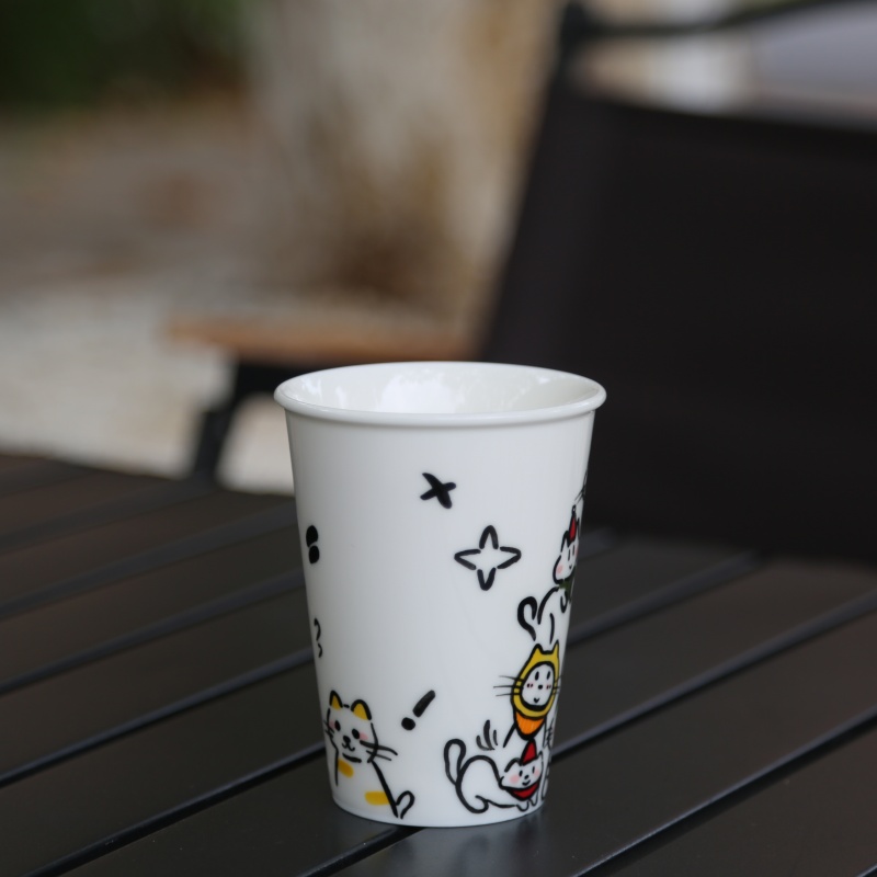 It brings a smile with its delightful collection of cartoon cats. Each feline friend boasts a unique personality, playfully depicted in a cluster of soft, warm tones. Some wear tiny red hats or scarves, adding a hint of festive cheer to their whimsical gathering. The clean white background makes the cheerful illustrations pop, creating an inviting and heartwarming visual. Perfect for brightening your day, this cup turns an ordinary coffee break into a moment of pure, playful joy. Its simple yet cheerful design is sure to delight cat lovers of all ages.