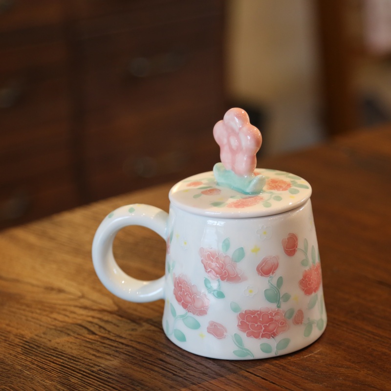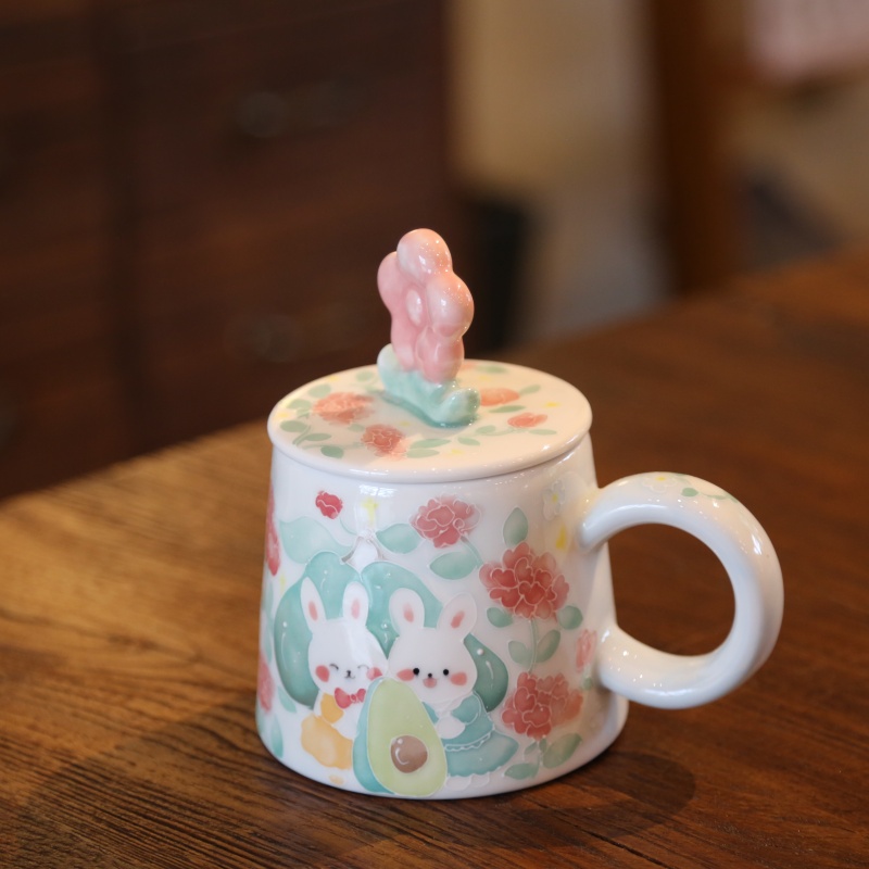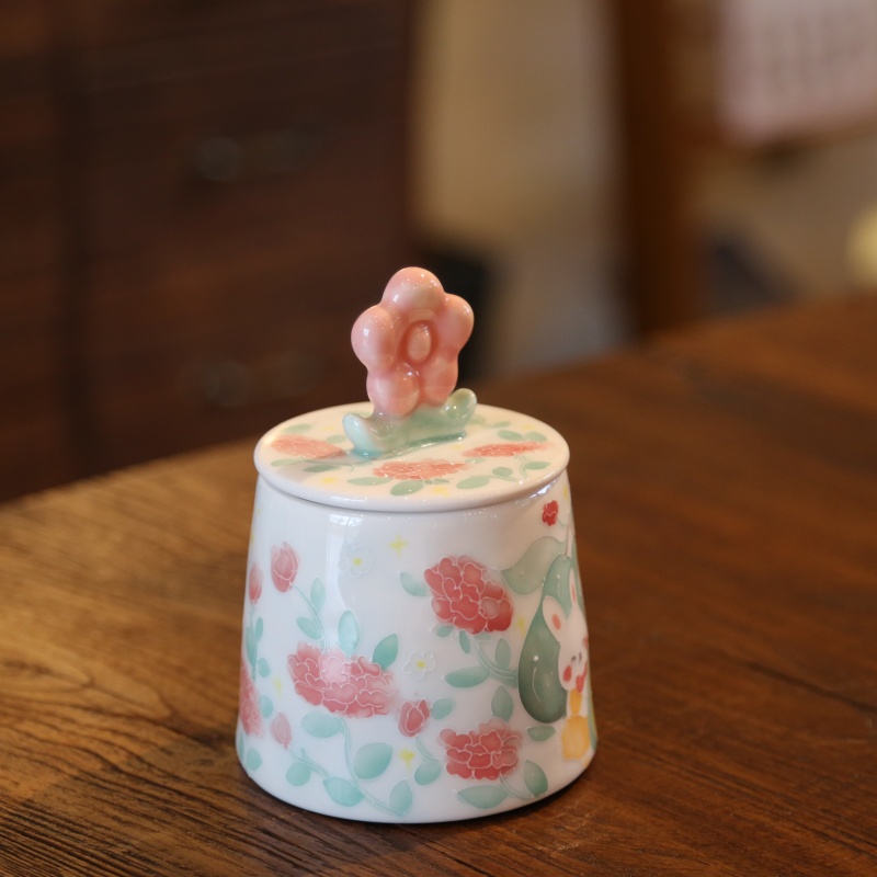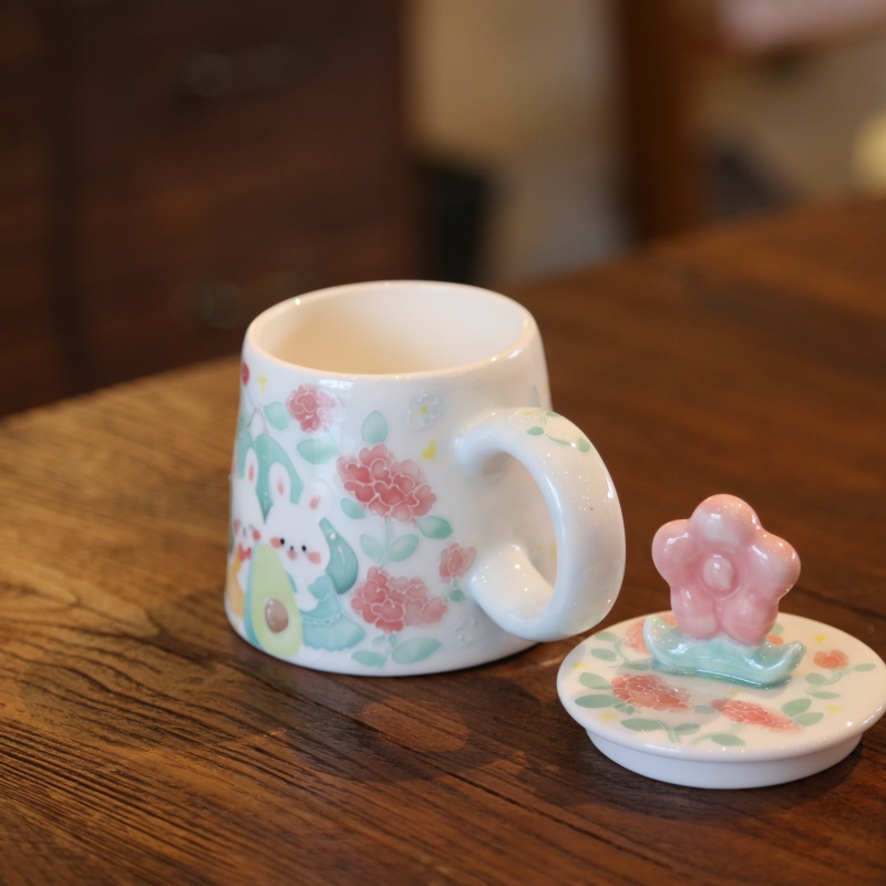This cup is crafted with three-dimensional glaze, giving the rabbits and floral patterns on its surface a raised, tactile texture that enhances the material richness. The lid, sculpted through hand-pinching techniques, takes the form of a delicate flower, resulting in a design that is both uniquely charming and endearingly cute.