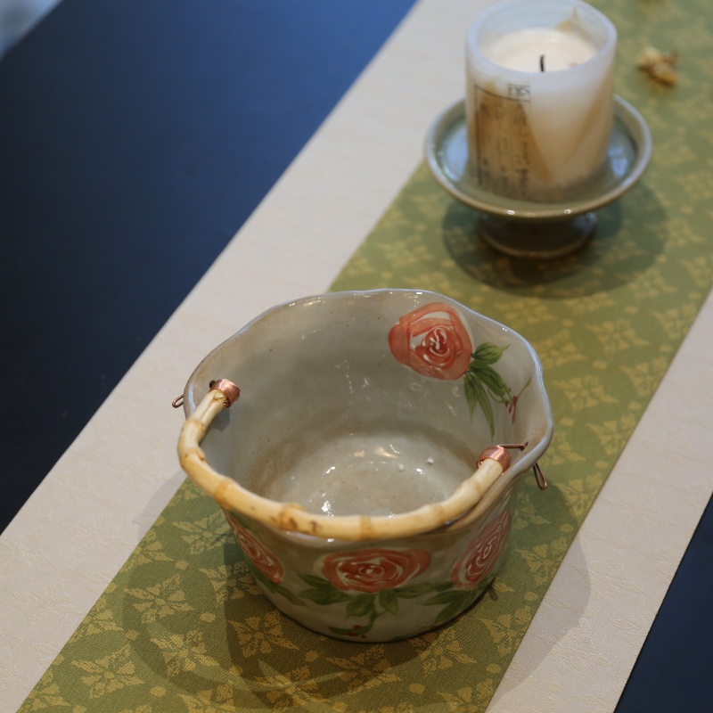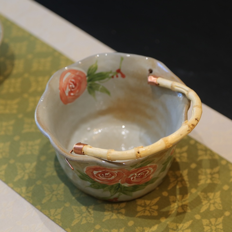 It shaped like a delicate basket with a charming bamboo – like handle, is perfect for coffee or tea. Adorned with lovely floral patterns (especially vivid roses) and green leaves, it blends artistry with functionality. The basket – like design gives it a unique, rustic charm, making it not only a practical drinkware but also a delightful decorative piece to enhance your table or shelf.