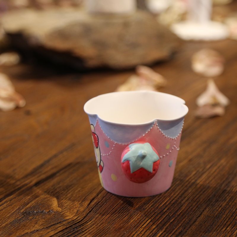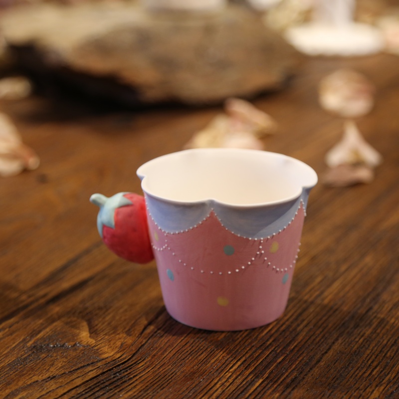 This cup is crafted with three-dimensional glaze, creating raised, tactile textures in certain areas that lend it a distinct material elegance. The handle, sculpted through hand-pinching techniques, takes the shape of a strawberry—a uniquely charming and delightfully cute design detail.