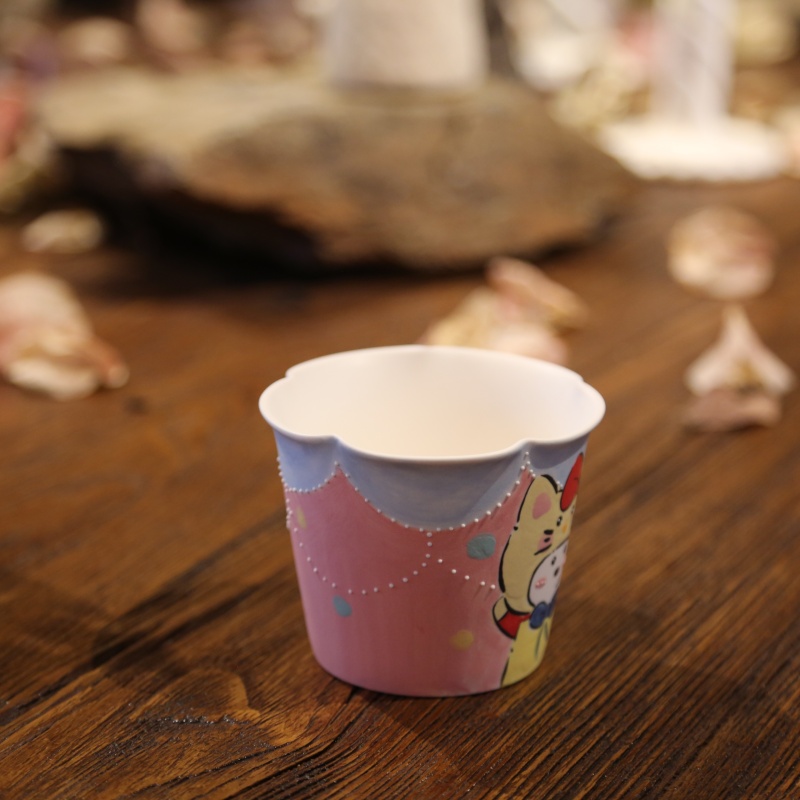 This charming pink paper cup instantly delights with its whimsical design, featuring an adorable cartoon cat wearing a bright red bow. Accented by playful blue polka dots, the cup boasts a unique and functional strawberry-shaped handle in vibrant red and green. Perfect for serving hot beverages at a cozy cafe or a cheerful party, it combines practicality with irresistible cuteness.