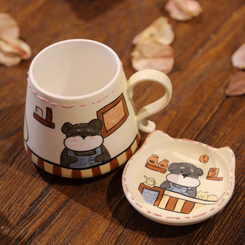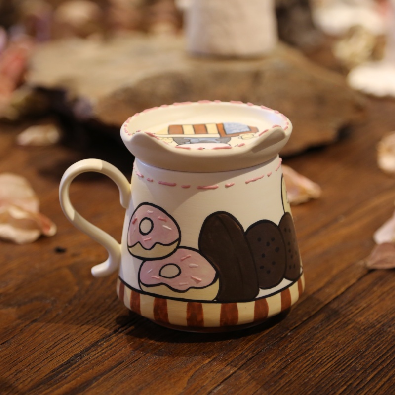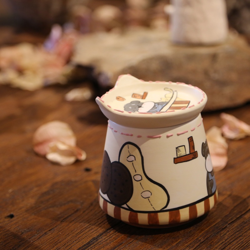 This charming ceramic mug captures hearts with its unique cat-ear lid and sweet illustration of a bear in denim overalls standing by a cottage. The warm, earthy color palette and smooth glaze enhance its cozy appeal. Perfect for hot beverages or as a decorative accent, this mug blends whimsical design with everyday functionality. Its playful yet practical nature makes it an ideal companion for cozy moments or a delightful gift for animal lovers seeking a touch of daily joy.