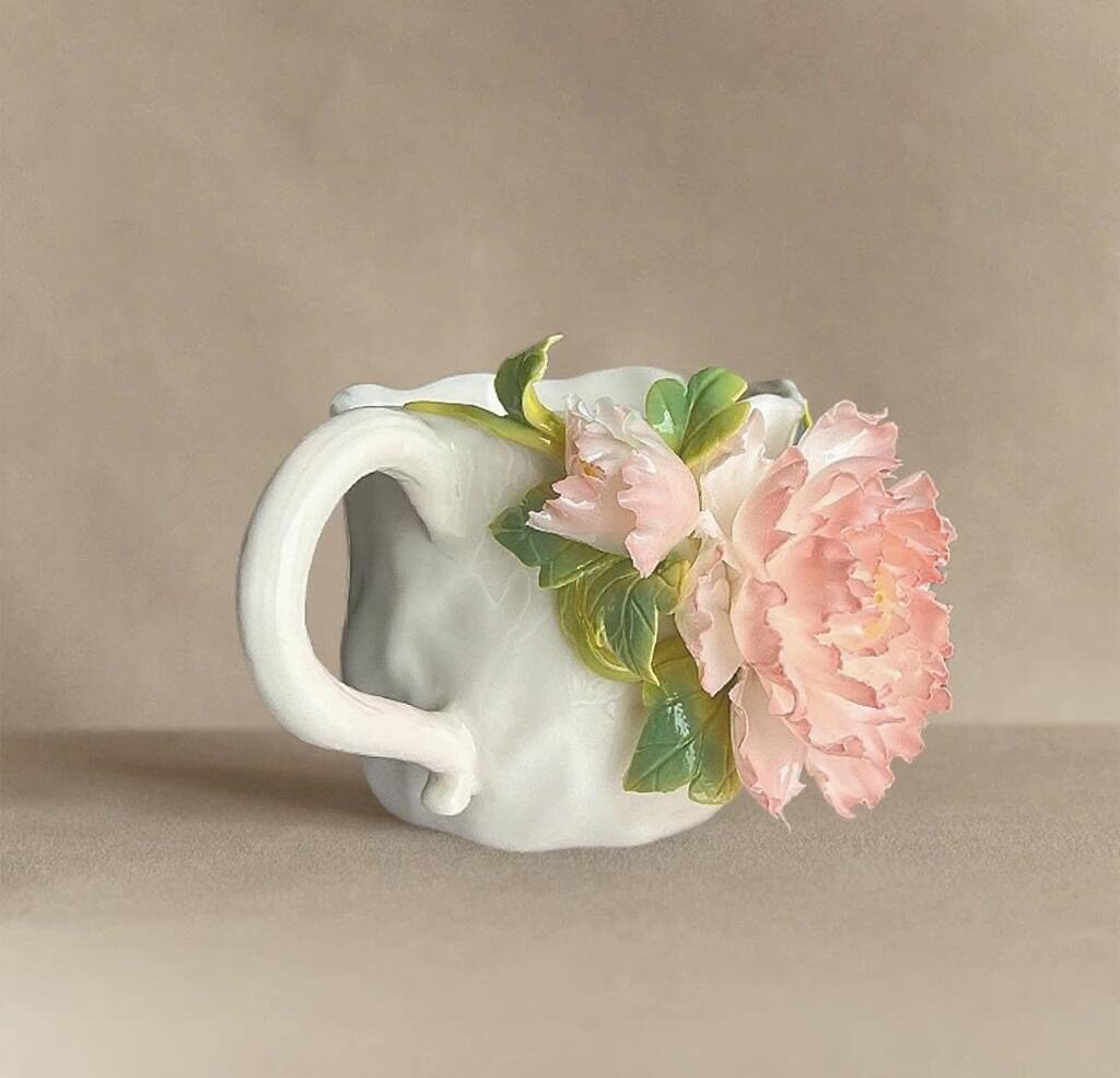 This charming cup is a work of art, featuring exquisite three-dimensional floral decorations. A large, lifelike pink flower with intricately detailed petals serves as the stunning centerpiece. It is beautifully complemented by smaller blossoms and green leaves, all adorning a pristine white ceramic base. More than just functional, this cup combines elegance and artistry, bringing a touch of natural beauty to any table setting.