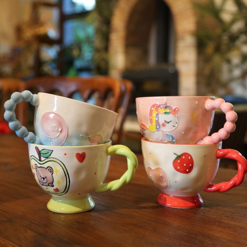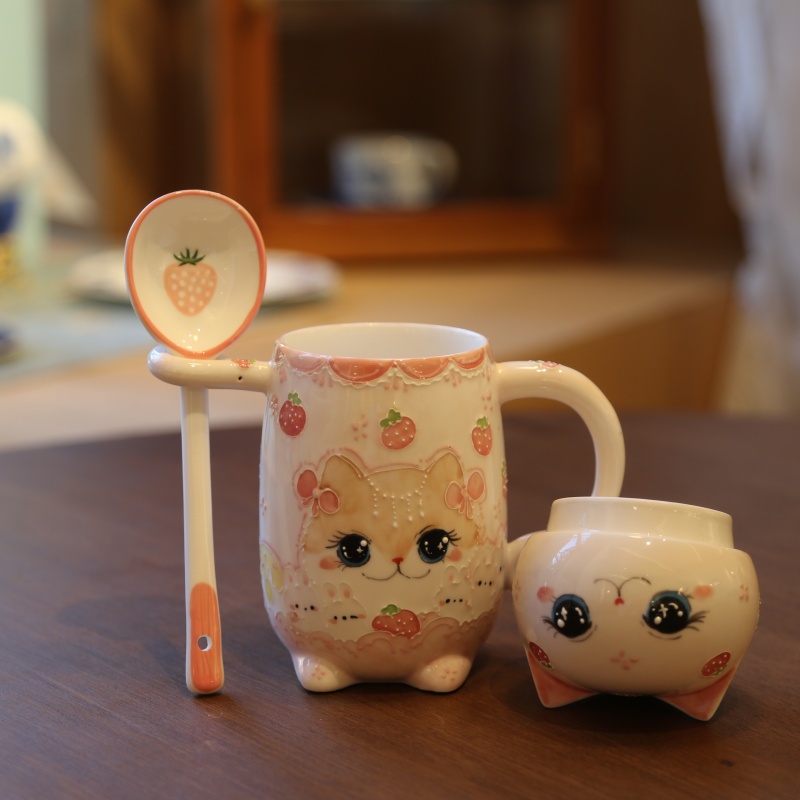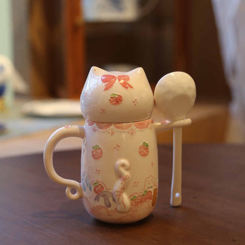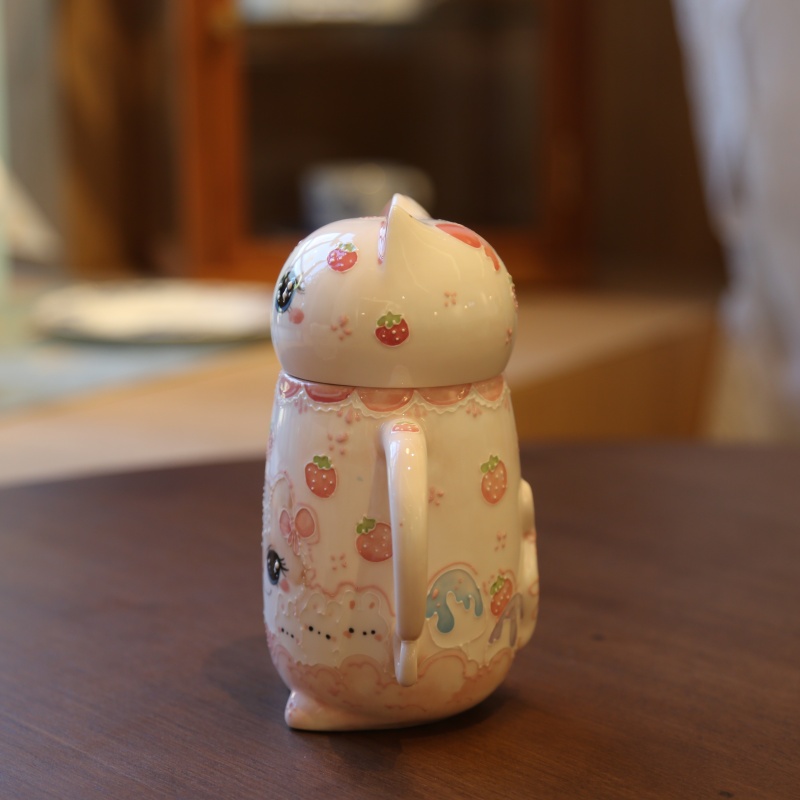 This adorable cat – shaped mug is a delightful piece! With big, sparkling eyes and a sweet expression, it looks just like a cute little kitten. The body of the mug is decorated with charming strawberry patterns and another lovely cat face. It comes with a matching spoon that has a strawberry design too. Perfect for enjoying your favorite drinks, it also makes a wonderful decorative item or a sweet gift for cat lovers.