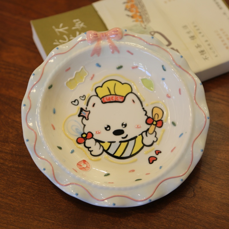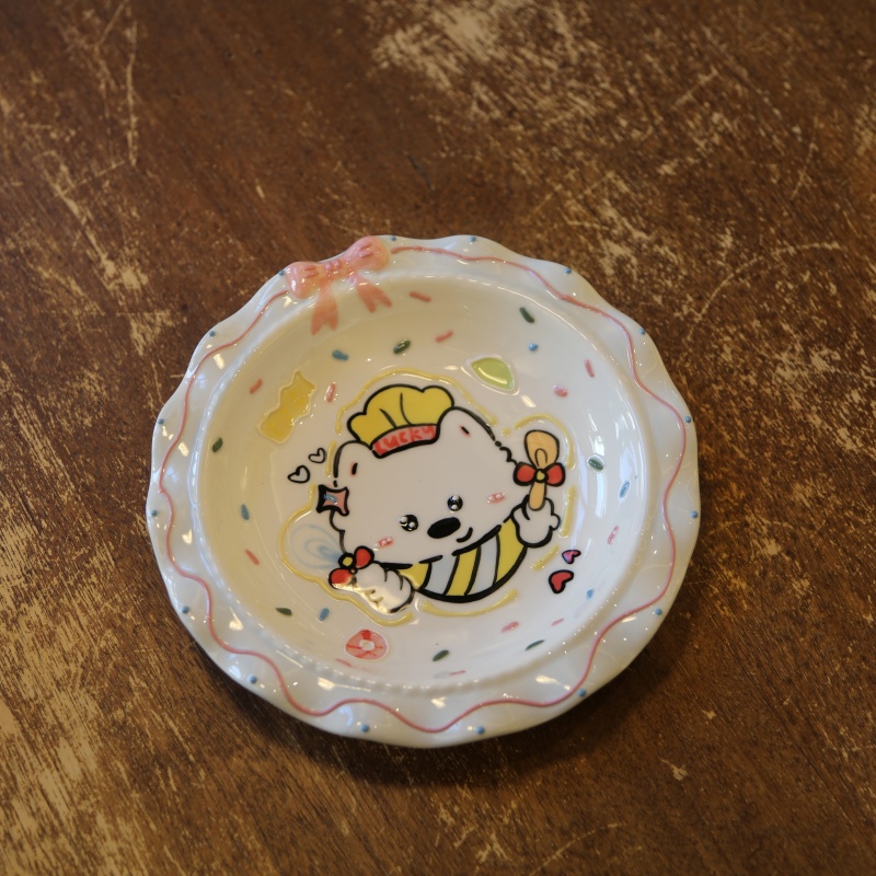 This adorable plate,features a charming cartoon bear dressed as a chef. The bear wears a yellow chef’s hat and holds utensils with red bows, surrounded by hearts and colorful sprinkles. A pink bow adorns the rim, adding a sweet touch. With its playful design and soft colors, this plate is perfect for serving snacks or decorating a kitchen, bringing a cheerful, whimsical vibe to any setting.
