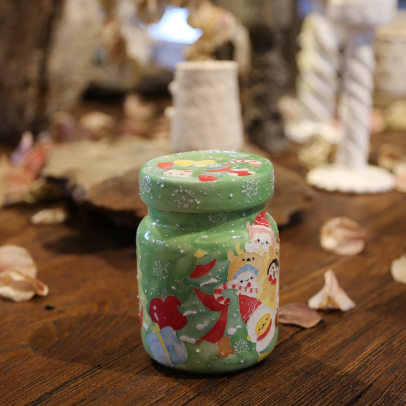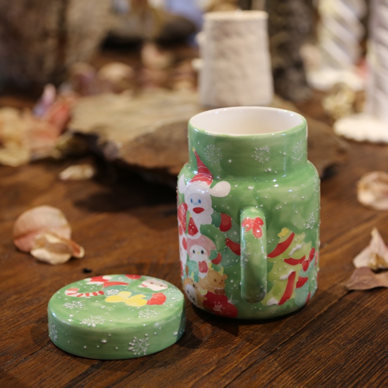 This charming green ceramic mug is a perfect embodiment of Christmas cheer. Its surface is beautifully hand-painted with cheerful, cartoon Santa Claus figures in their iconic red hats, set against a backdrop of delicate snowflakes. The matching lid, dotted with tiny white specks like falling snow, completes the festive look. Crafted for comfort with a sturdy handle, this mug is ideal for enjoying hot cocoa or cider during the holiday season. The classic red and green color scheme radiates a warm, inviting glow, making it a delightful centerpiece for any cozy winter setting.