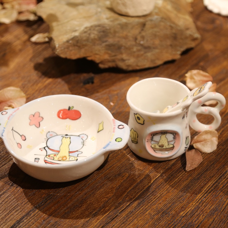 This delightful tableware set features a charming blue-themed design with an adorable mouse character enjoying a meal. The bowl and cup showcase colorful illustrations of noodles, apples, and stars, creating a playful eating environment. This tableware set will fill your daily life with childlike whimsy.