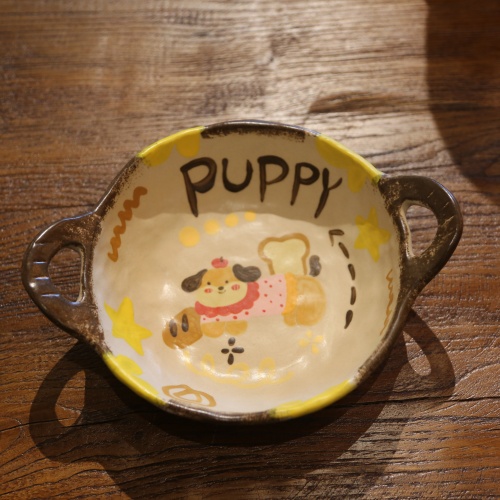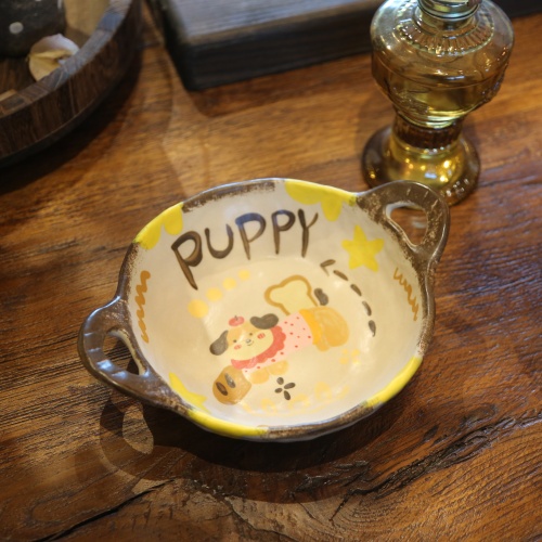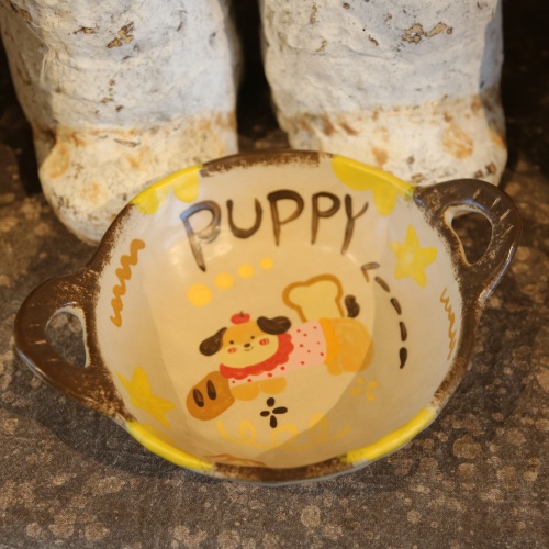 This charming ceramic plate features a playful puppy design with stars, paired with the cute “PUPPY” text. The light yellow base and yellow rim create a warm, cheerful look. With two brown handles for easy carrying, it’s perfect for serving snacks or as a delightful decorative piece. Ideal for pet lovers and adding whimsy to any table setting.