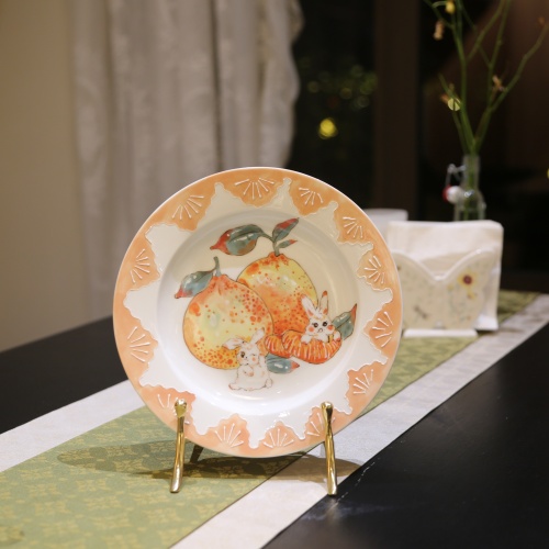 This exquisite porcelain plate showcases a delightful scene of two playful rabbits amidst orange fruits, surrounded by intricate floral motifs. The golden display stand enhances its elegance, perfect for home decor or special occasions.