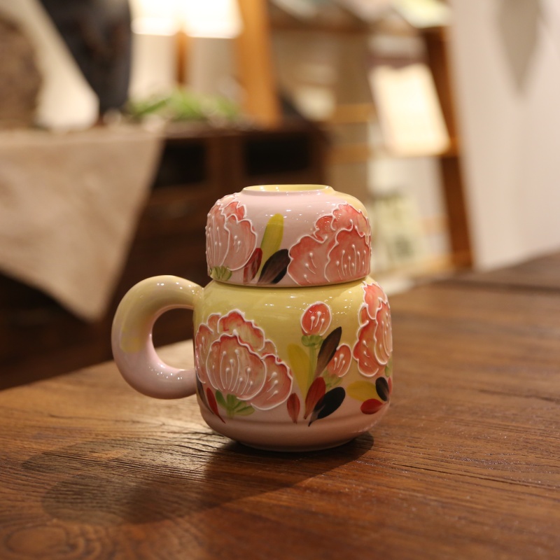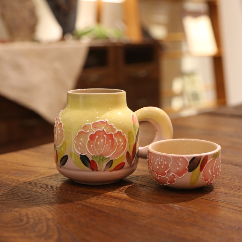 This is a charmingly round cup that exudes cuteness. Its soft – colored body, adorned with delicate floral patterns (featuring pink blooms and vibrant leaves), gives it a lovely, artistic look. The plump, rounded shape makes it visually appealing and easy to hold. Whether used for sipping tea or as a decorative piece, this adorable cup adds a touch of warmth and beauty to any space.
