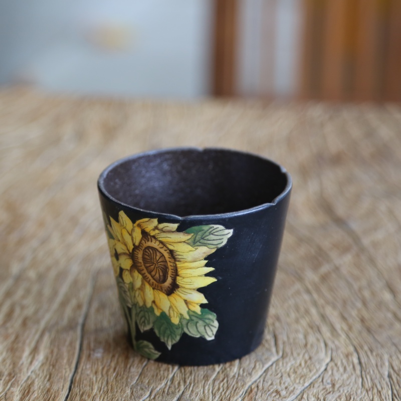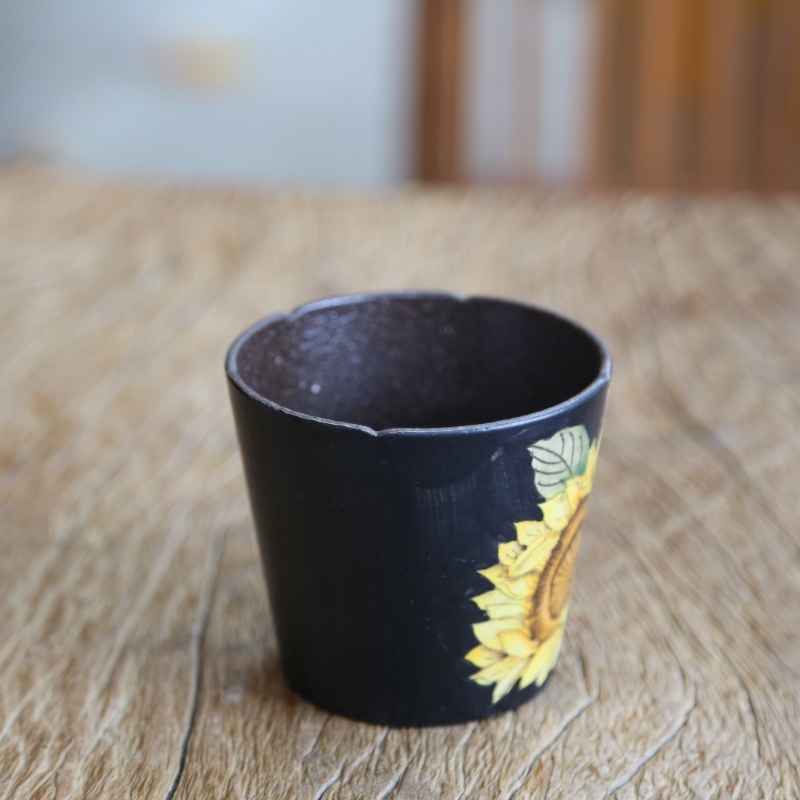 In addition, it is also decorated with three-dimensional glaze, giving certain parts of the design a raised, tactile quality.This striking ceramic mug makes a bold statement with its deep black matte finish, serving as the perfect backdrop for a vibrant, hand-painted sunflower. The cheerful bloom, with its bright yellow petals and detailed brown center, stretches gracefully across the surface, accompanied by green leaves that add a touch of natural elegance. The rustic charm of the cup is enhanced by its slightly textured appearance, suggesting a unique, artisanal quality.